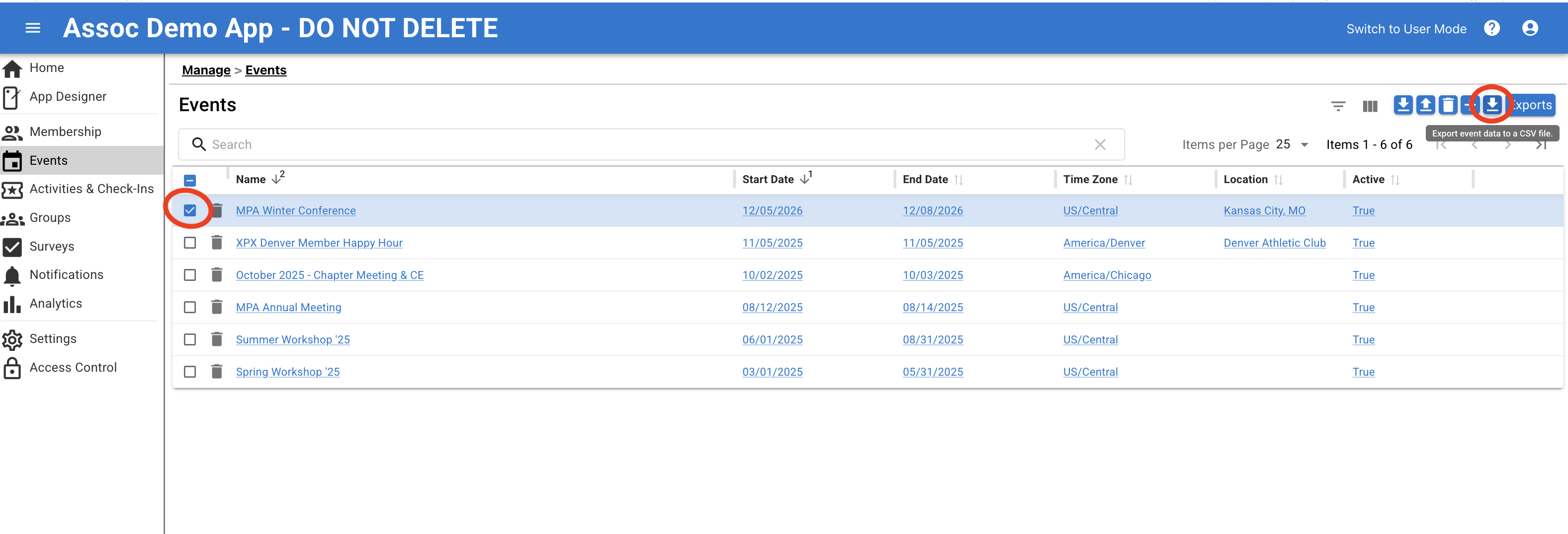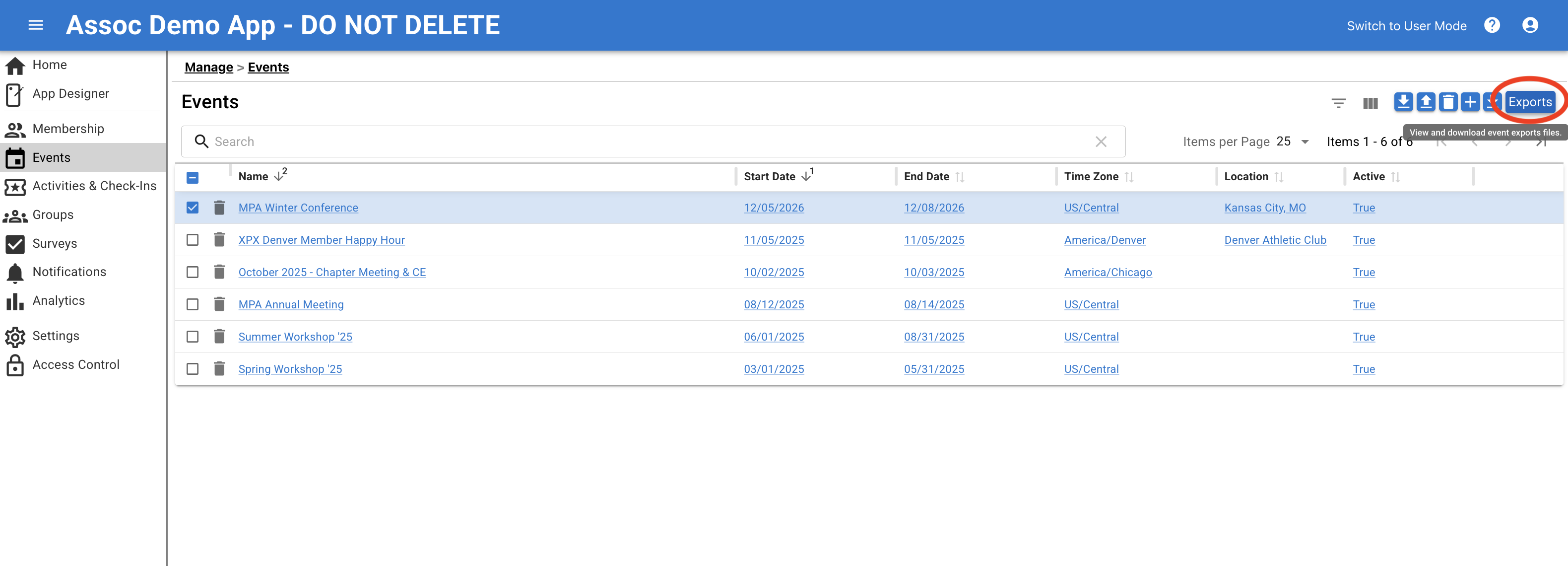 Click 'Export event data into a CSV file' in the top right corner, then select 'Exports'
